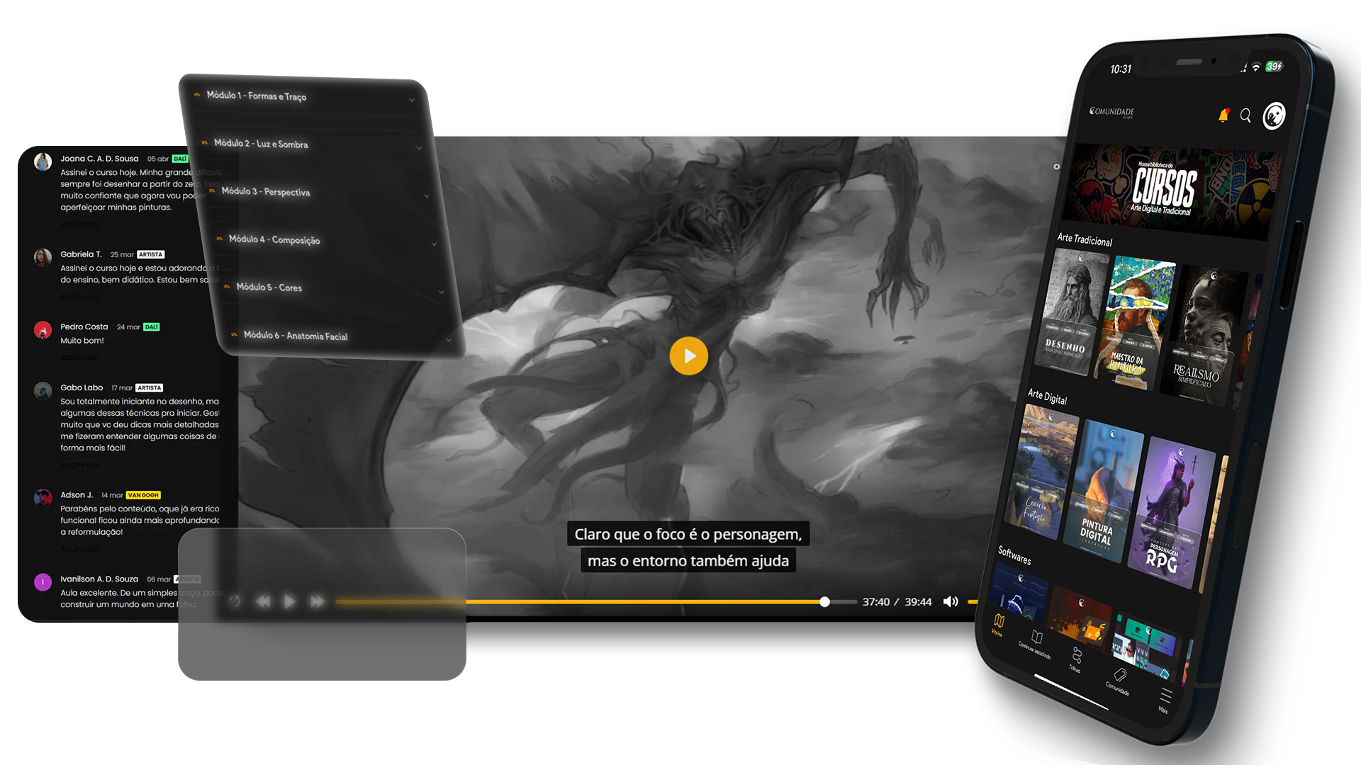 Na Comunidade da Arte, encontrei uma plataforma bem organizada, com vídeos claros, conteúdo acessível e até a sensação de estar usando uma “Netflix da arte”.